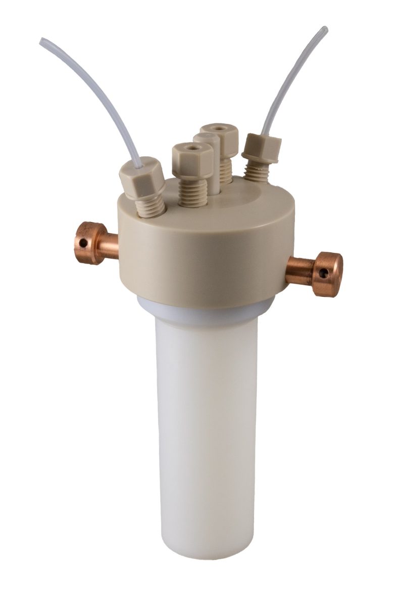 Multi-funktionaler Reaktorverschluss (4-Port Cap): Der Verschluss bietet vier Durchführungen: 2x 1/8″ (ID = 3,2 mm), 2x 1/16″ (ID 0 1,6 mm). Hierüber lassen sich Schläuche (Begasung, Interisierung, Zudosierung, Probenahme), Sensoren (Monitoring, Reaktionstemperaturkontrolle) und Micro-Referenelektroden (Voltammetrie, Potentiometrie) in den Versuchsaufbau integrieren.