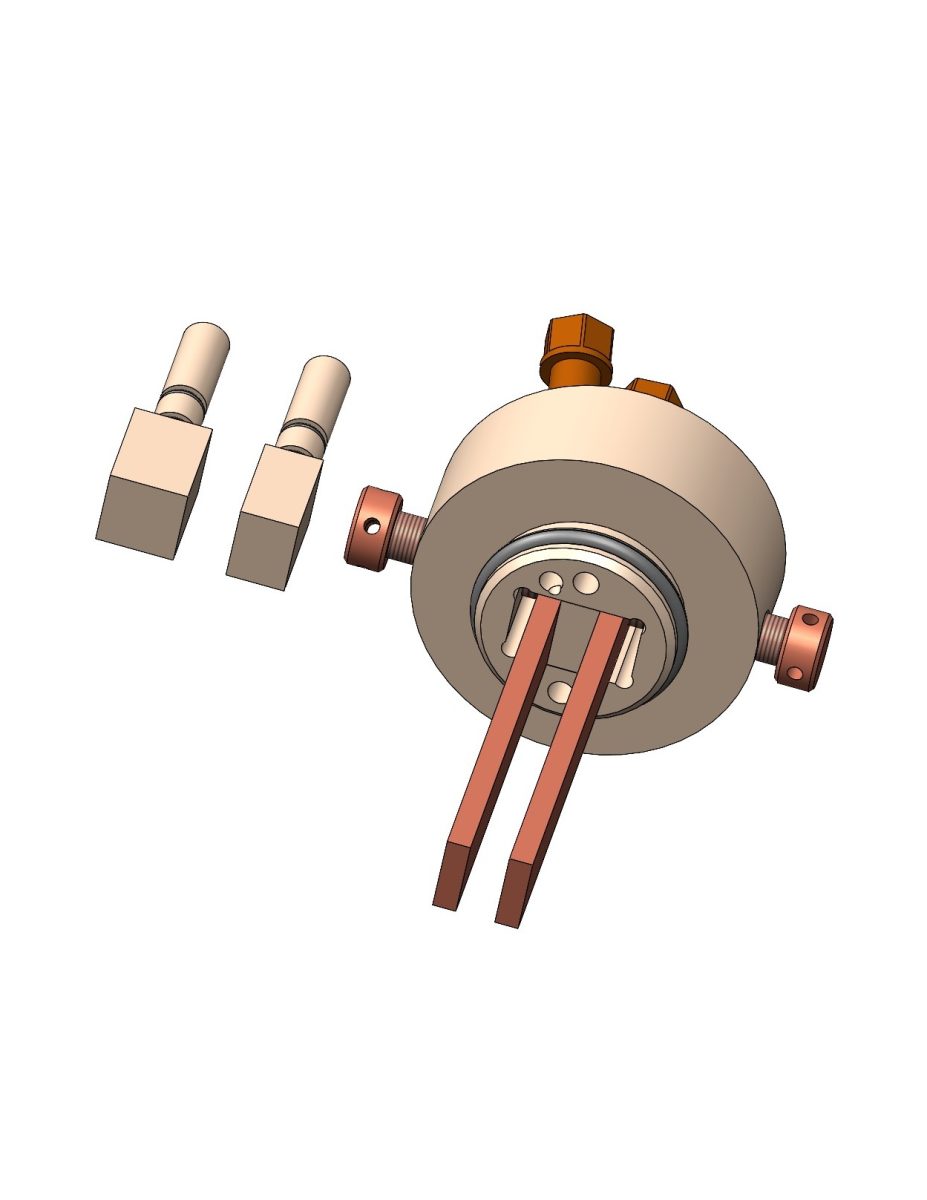Elektrische Kontaktierung: Eine Kontaktierung mit geringem elektrischen Widerstand zu den Elektroden wird über vergoldetet Kupferschrauben im Reaktordeckel hergestellt. In diese Schrauben können 2 mm Bananenpins gesteckt werden um Verbindung zu einer Spannungsquelle bzw. einem Potiostaten herzustellen.