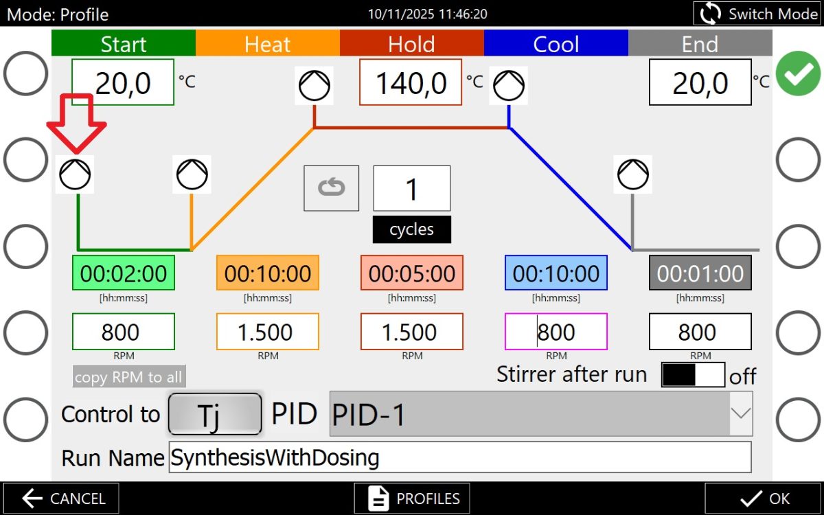 Zur Veranschaulichung wird im Folgenden die Integration der Dosing Pump in einen Reaktionsprofil Modus gezeigt: