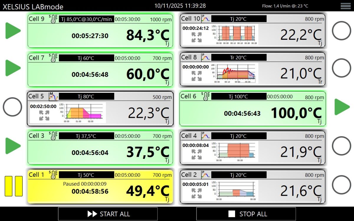 Der Homescreen gibt die Anordnung der Reaktorpositionen in der Aufsicht wieder, jedes Bedienfeld steht stellvertretend für einen der 10 Reaktorschächte der xelsius workstation:
