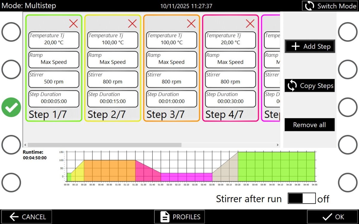 Reaktionsprofile die im Multistep- oder ProfilModus erstellt wurden können benannt, gespeichert und wieder geladen werden.